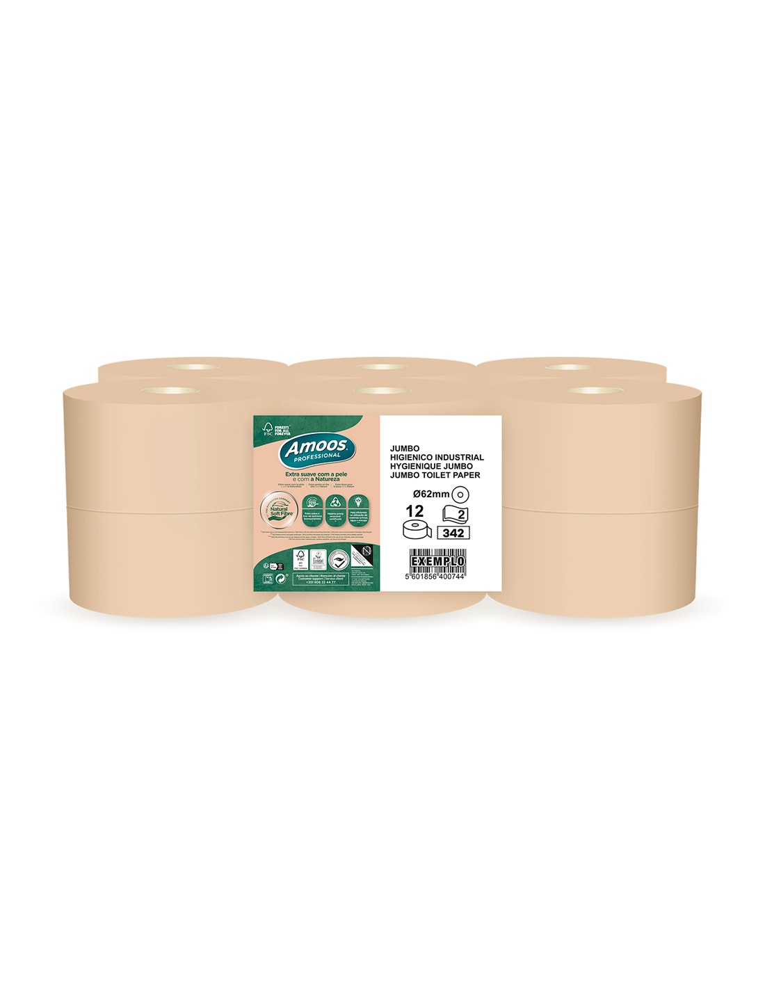 Papel higienico amoos naturally jumbo professional 2 capas pasta cruda paquete de 12 rollos 120 m